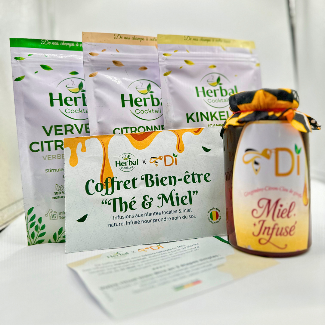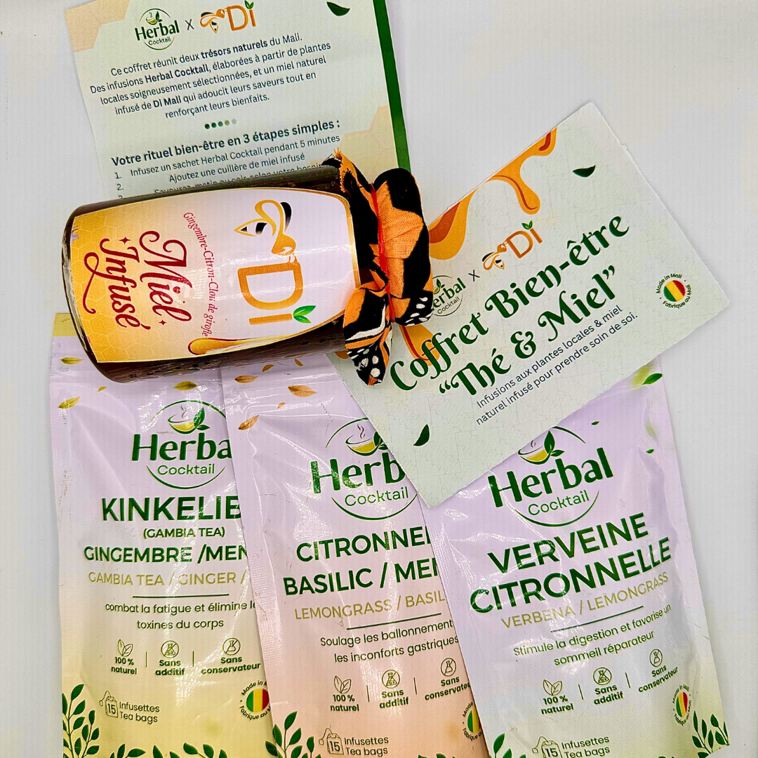 Le Coffret Bien-Être Thé & Miel – Herbal Cocktail × Di Mali est le fruit d’une collaboration entre deux marques maliennes engagées dans la valorisation des produits naturels locaux.